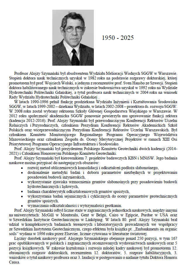 Profesor A. Szymański był prezydentem Polskiego Komitetu Geotechniki dwóch kadencji (2014-2021) i Członkiem Honorowym Polskiego Komitetu Geotechniki.